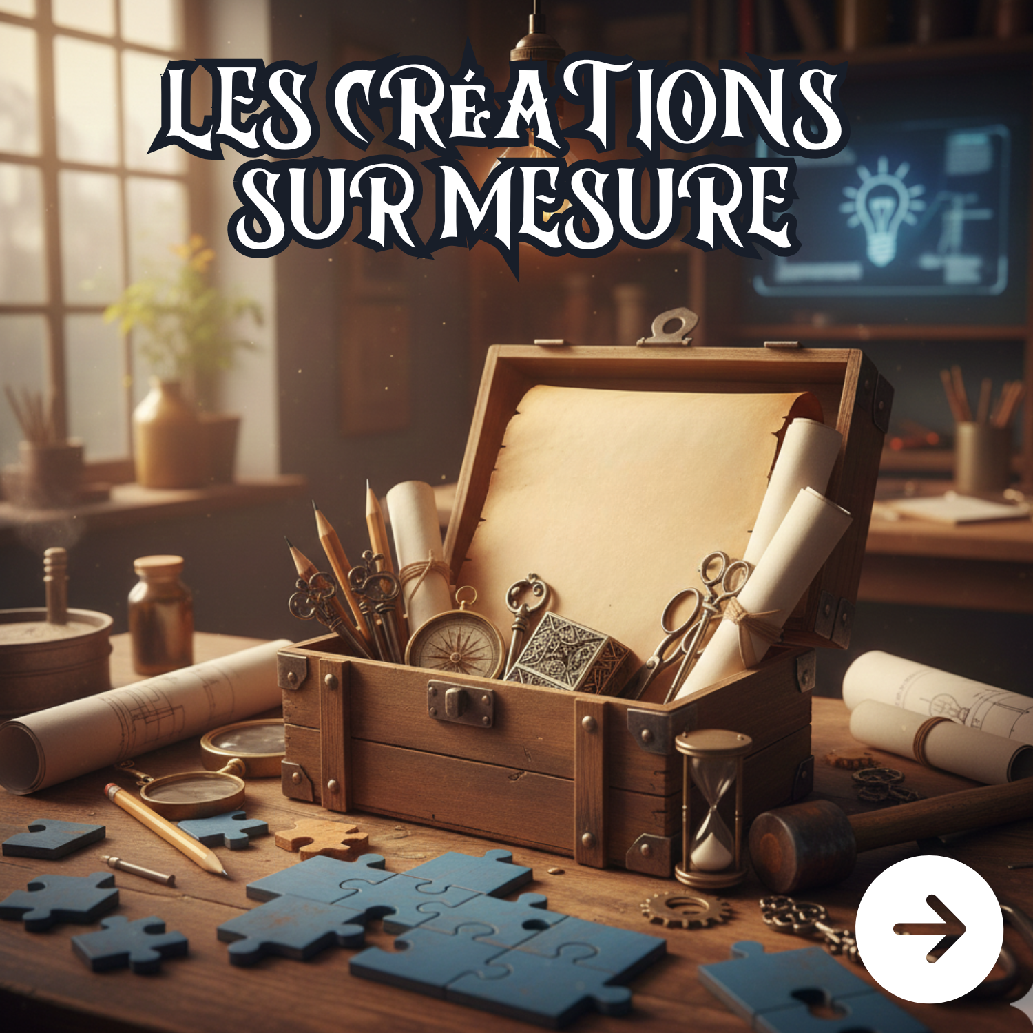 Nos créations sur mesure donnent vie à des aventures uniques, imaginées spécialement pour votre lieu, votre public et vos objectifs. Escape games, jeux de piste ou expériences immersives : chaque projet est conçu de A à Z pour offrir une expérience ludique qui vous ressemble.