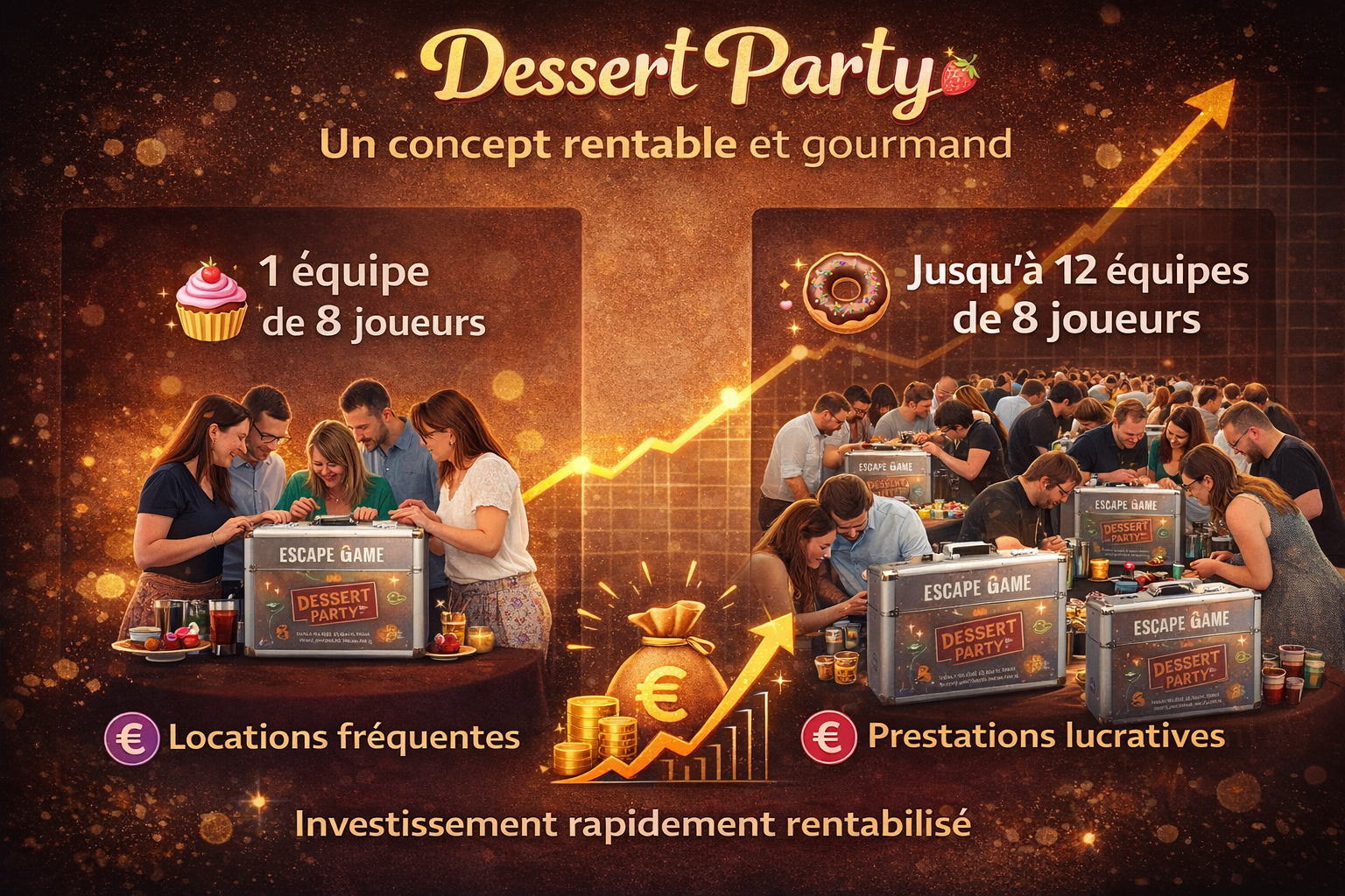 Dessert Party a été conçu comme un produit à fort potentiel de rentabilité, capable de s’adapter à des contextes variés grâce à ses deux formats de jeu complémentaires. Cette double exploitation permet de multiplier les opportunités commerciales tout en optimisant l’utilisation du matériel.
